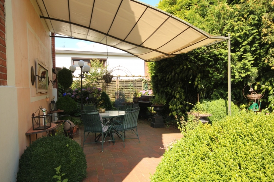 Der zur Straße hin liegende Garten ist nach Süden ausgerichtet und zur Straße hin gut eingewachsen. Es befindet sich ein kleiner Teich mit Sitzplatz direkt vor dem Haus und eine überdachte Terrasse rechts am Haus. Vor der Garage mit elektrischem Tor kann man ein weiteres Fahrzeug abstellen.