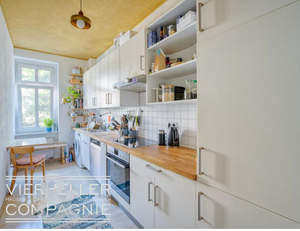 Das Wohnkomplex ist kernsaniert. Die finanzielle Situation der Wohnungseigentümergemeinschaft ist geordnet. Die Instandhaltungsrücklage beträgt Stand 26.8.2025 ca. 138 000 Euro. Die schlichte und formschöne Einbauküche bietet ausreichend Platz für einen Esstisch. Das Vollbad mit Tageslicht ist mit weißen Fliesen mit blauem Fries ausgestattet. Die hohen Zimmerdecken mit gut erhaltenem Stuck und die stilvollen Holzprofiltüren unterstreichen das charmante Altbauambiente. Die Fenster wurden erneuert.
