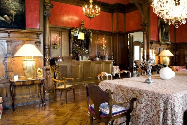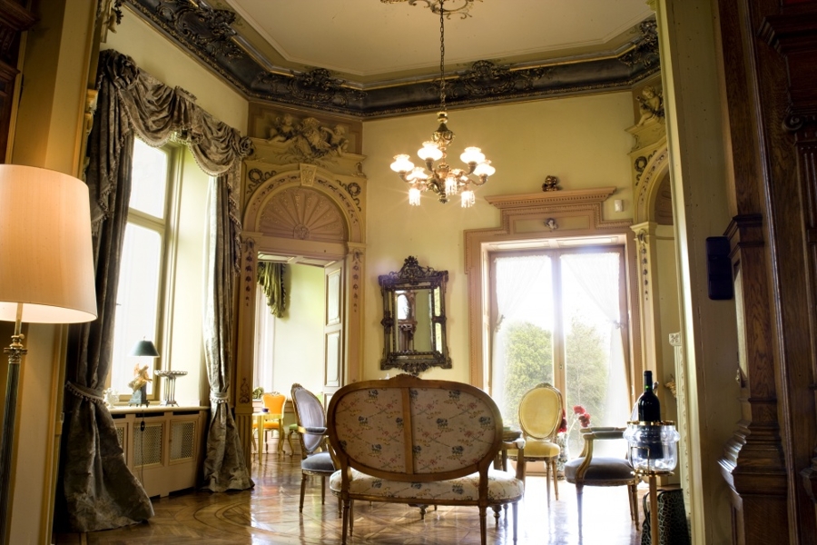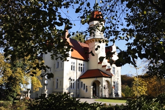 Das Herrenhaus verfügt über zwei Vollgeschosse und einen hohen Turm, der als Aussichtsturm den Blick über die parkartige Anlage zulässt. Die Innenausstattung mit Vertäfelungen, gespachtelten Wänden und Deckengemälden ist extrem hochwertig.
